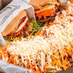 Pão, Carne, Ovo, Frango Desfiado, Bacon, Queijo, Presunto, Cheddar, Salada, Batata Palha, Maionese e Catchup.