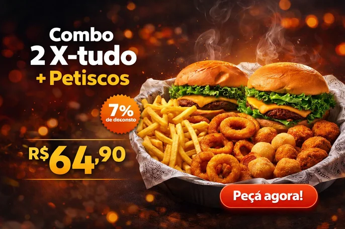 Combo vai com na caixa de 30cm com 2 xtudos + porção de batata frita + 6 anéis de cebola + 10 salgadinhos + 6 nuggets + maionese caseira e catchup.