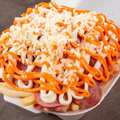 Batata frita crocante coberta com bacon, calabresa, frango desfiado, cheddar cremoso, catupiry e finalizada com parmesão ralado.